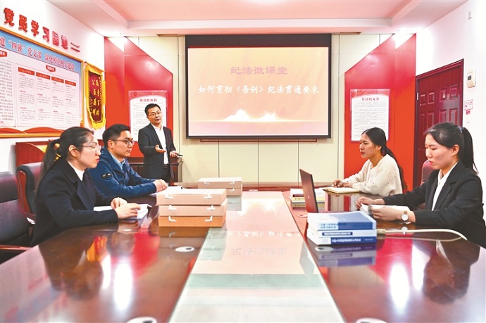 江西省新余市紀(jì)委監(jiān)委不斷強(qiáng)化紀(jì)檢監(jiān)察干部對執(zhí)紀(jì)執(zhí)法貫通理念的理解運用,建立“通報講評”機(jī)制,針對實踐中發(fā)現(xiàn)的難點問題及時分析講解,提升案件辦理質(zhì)效。圖為該市紀(jì)委監(jiān)委案件審理室圍繞新修訂的紀(jì)律處分條例,解讀紀(jì)法銜接條款的理解運用。黃磊 攝