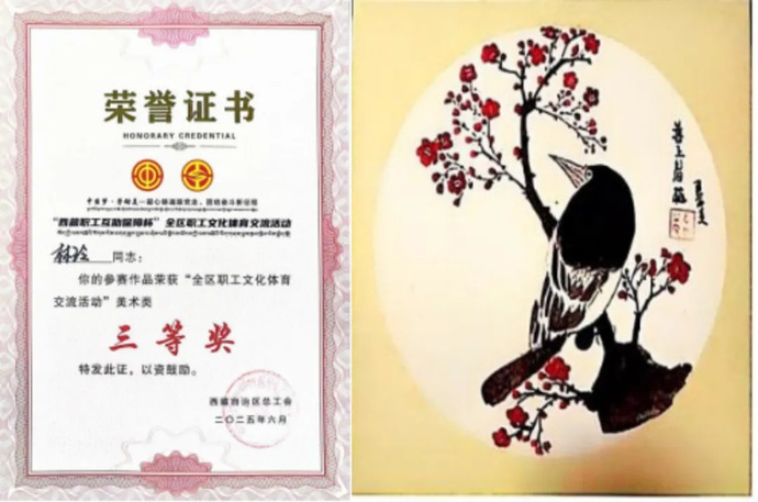 為深入學(xué)習(xí)習(xí)近平新時(shí)代中國特色社會(huì)主義思想,全面貫徹黨的二十大和二十屆二中、三中全會(huì)以及中國工會(huì)十八大精神,致敬百年工會(huì)歷程,慶祝西藏自治區(qū)成立60周年、中華全國總工會(huì)成立100周年,西藏自治區(qū)總工會(huì)于今年4月至6月在拉薩舉辦“中國夢·勞動(dòng)美——凝心鑄魂跟黨走、團(tuán)結(jié)奮斗新征程”“西藏職工互助保障杯”全區(qū)職工文化體育交流活動(dòng),并于6月27日在西藏大學(xué)文化藝術(shù)中心舉行了盛大的頒獎(jiǎng)儀式。西藏開投集團(tuán)工會(huì)會(huì)員林玲的作品《喜上眉梢》榮獲三等獎(jiǎng)。