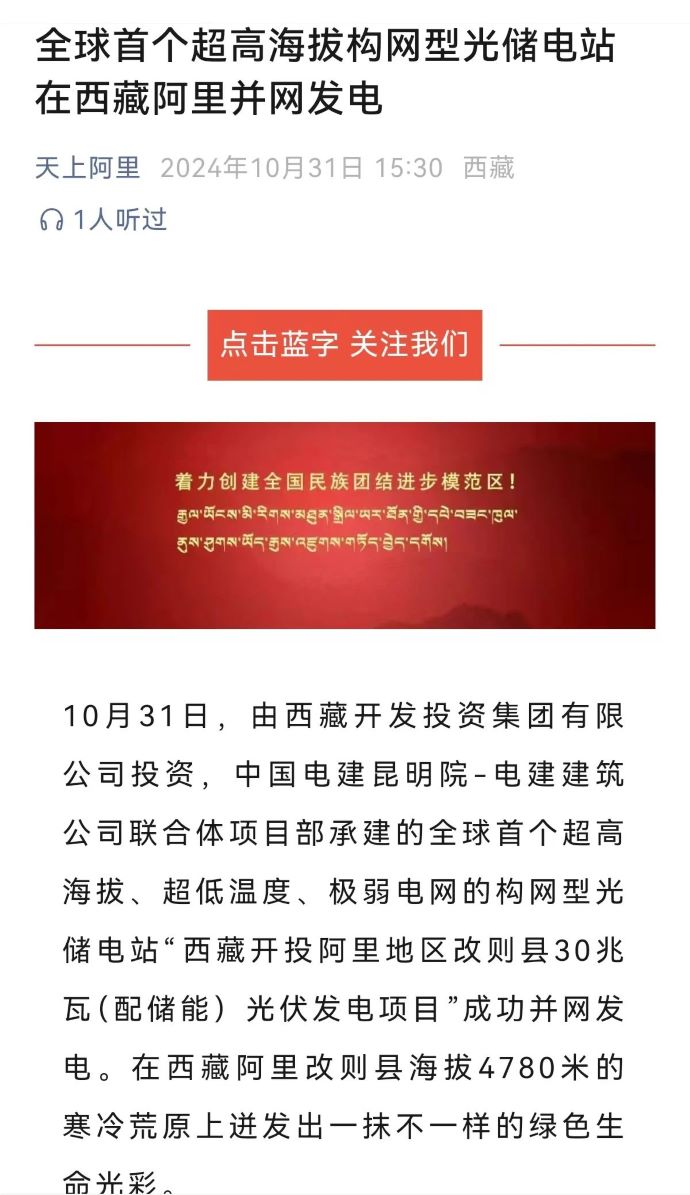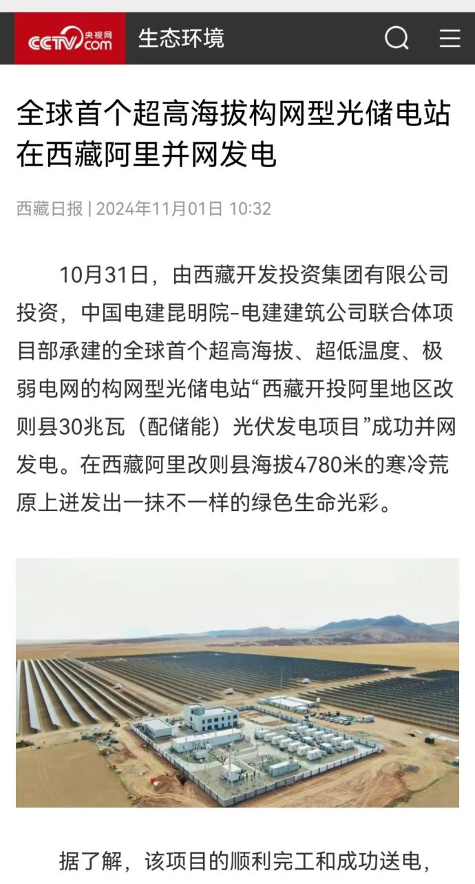 10月31日,由西藏開投集團(tuán)投資、中國電建昆明院-電建建筑公司聯(lián)合體項(xiàng)目部承建的,全球首個(gè)超高海拔、超低溫度、極弱電網(wǎng)智能組串式構(gòu)網(wǎng)型光儲(chǔ)電站——西藏開投阿里地區(qū)改則縣30兆瓦(配儲(chǔ)能)光伏發(fā)電項(xiàng)目,成功并網(wǎng)發(fā)電,標(biāo)志著新能源技術(shù)在高原地區(qū)的重大突破。