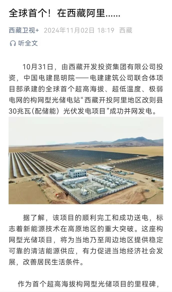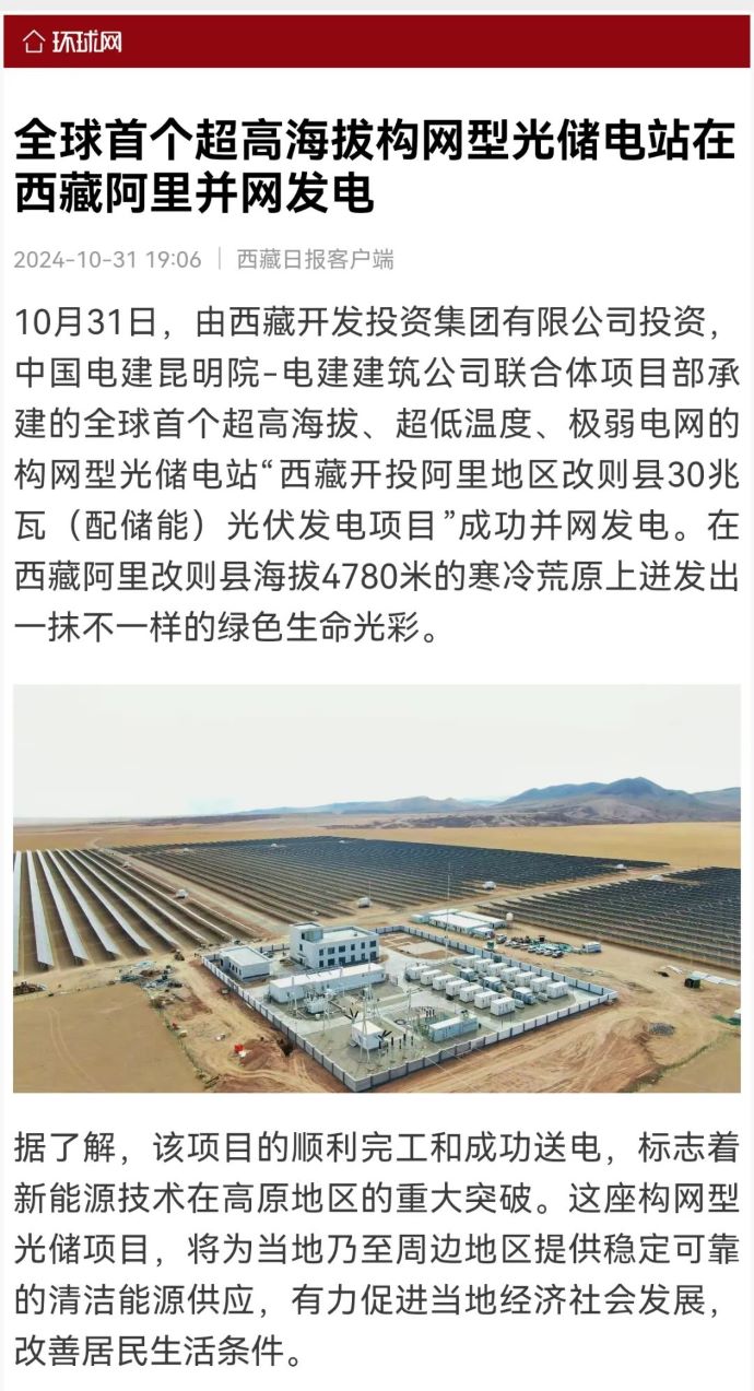 媒體報(bào)道丨全球首個(gè)超高海拔構(gòu)網(wǎng)型光儲(chǔ)電站在西藏阿里并網(wǎng)發(fā)電
