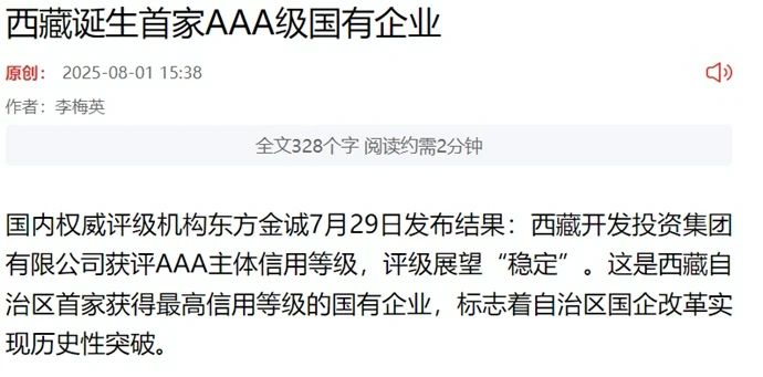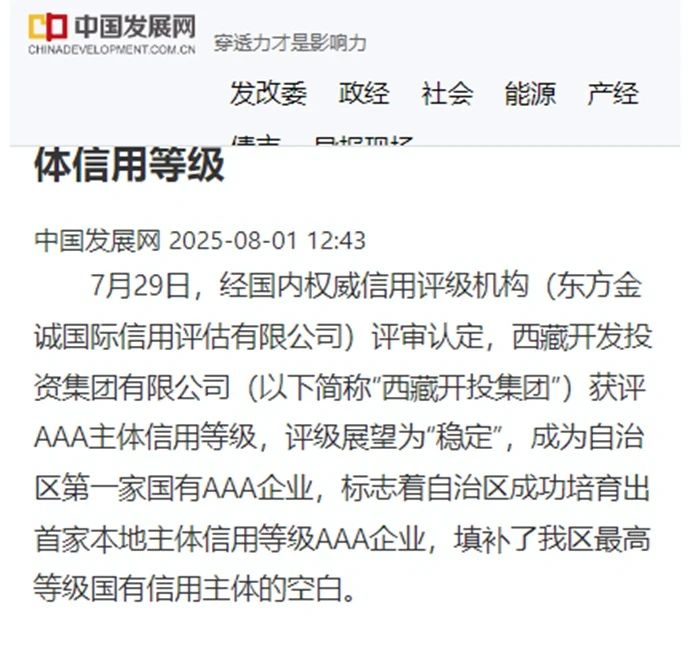 近期,中國發(fā)展網(wǎng)、西藏日報客戶端、西藏商報等媒體聚焦報道西藏開發(fā)投資集團(tuán)有限公司獲評AAA主體信用等級消息。7月29日,經(jīng)國內(nèi)權(quán)威信用評級機(jī)構(gòu)(東方金誠國際信用評估有限公司)評審認(rèn)定,西藏開發(fā)投資集團(tuán)有限公司獲評AAA主體信用等級,評級展望為“穩(wěn)定”,成為自治區(qū)第一家國有AAA企業(yè),標(biāo)志著自治區(qū)成功培育出首家本地主體信用等級AAA企業(yè),填補(bǔ)了我區(qū)最高等級國有信用主體的空白。