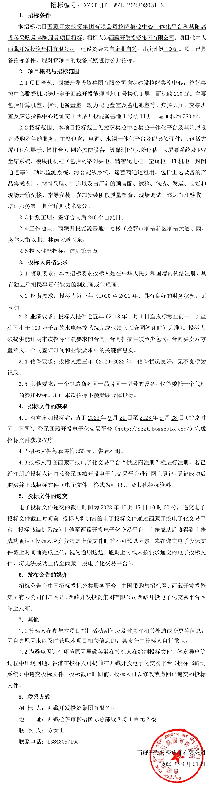 西藏開發(fā)投資集團(tuán)有限公司拉薩集控中心一體化平臺(tái)和其附屬設(shè)備采購及伴隨服務(wù)項(xiàng)目招標(biāo)公告(第二次)