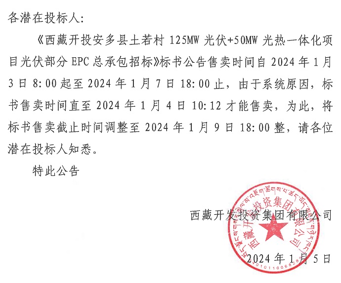 關(guān)于延長(zhǎng)《西藏開(kāi)投安多縣土若村125MW光伏+50MW光熱一體化項(xiàng)目光伏部分EPC總承包招標(biāo)》標(biāo)書(shū)售賣(mài)時(shí)間的公告
