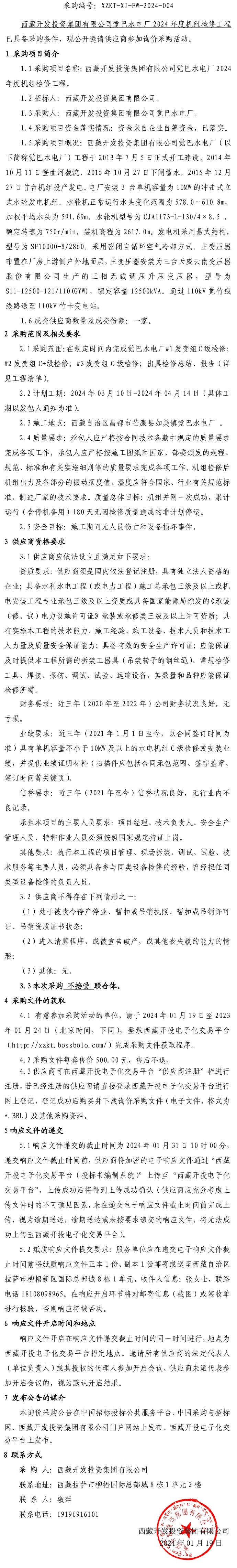 西藏開發(fā)投資集團(tuán)有限公司覺巴水電廠2024年度機(jī)組檢修工程詢價(jià)采購公告