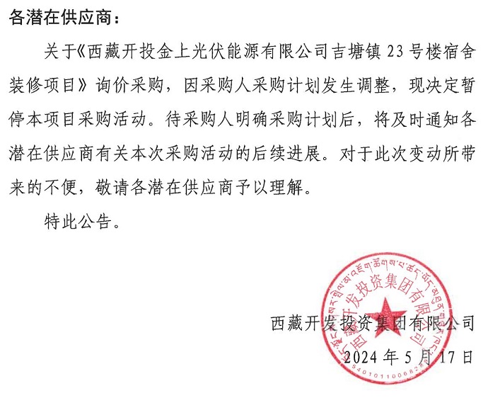 關(guān)于暫?!段鞑亻_(kāi)投金上光伏能源有限公司吉唐鎮(zhèn)23號(hào)樓宿舍裝修項(xiàng)目》詢(xún)價(jià)采購(gòu)活動(dòng)的公告