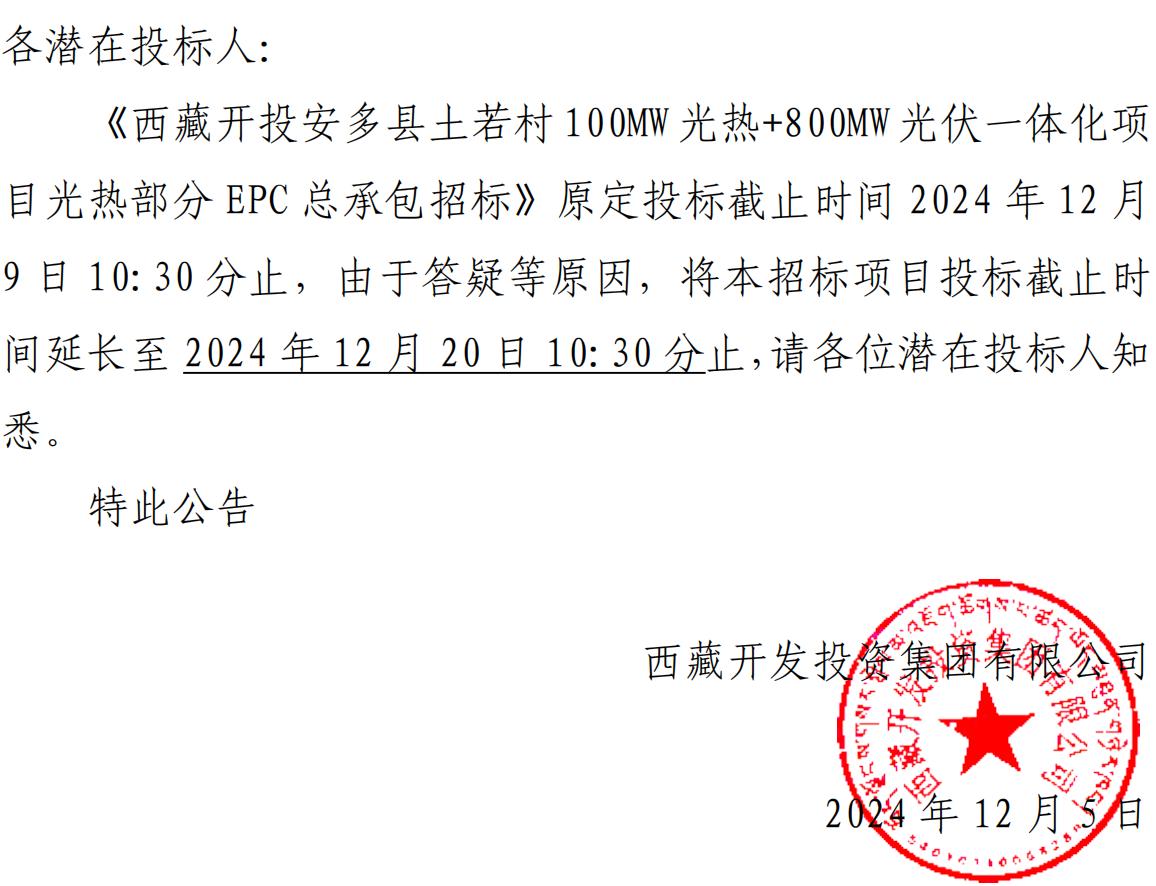 關(guān)于延長(zhǎng)《西藏開(kāi)投安多縣土碩 100MW 光熱+800MW 光伏一體化項(xiàng)目光熱部分 EPC 總承包招標(biāo)》投標(biāo)截止時(shí)間的公告